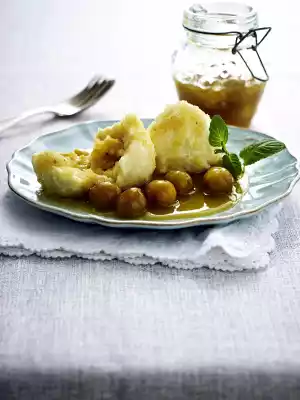 Melt 50 g butter in a small pan, add 50 g breadcrumbs, froth up briefly while stirring. Lift the dumplings out of the water with a ladle, drain and arrange 2 pieces on plates. Add some compote. Sprinkle dumplings with breadcrumbs butter and 1-2 tbsp. sugar, decorate compote with mint leaves. Add the rest of the compote and dumplings