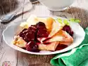 Wash the mirabelles and drain well. For the dumplings, cut open 12 mirabelles, remove the stone and add one sugar cube each, put aside. Stir the sauce powder, 1 packet of vanillin sugar and 3-4 tbsp. water until smooth. Place lemon juice, 50 g sugar, 200 ml water and grape juice in a saucepan, bring to the boil and stir in the sauce powder. Bring to the boil while stirring. Add the mirabelles and simmer on low heat for 5-6 minutes. Pour into a bowl and let cool