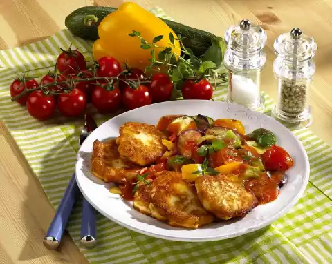Add strained tomatoes and 200 ml water, bring to the boil. Stir in stock. Cover and stew for approx. 20 minutes over a mild heat. Heat 2 tablespoons of oil in portions in a coated pan.