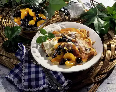 Arrange curd cheese margarine, apricots and blueberries on plates. Sprinkle almond flakes on top, dust with icing sugar and add a dash of crème fraîche to each plate. Serve garnished with lemon balm if desired.