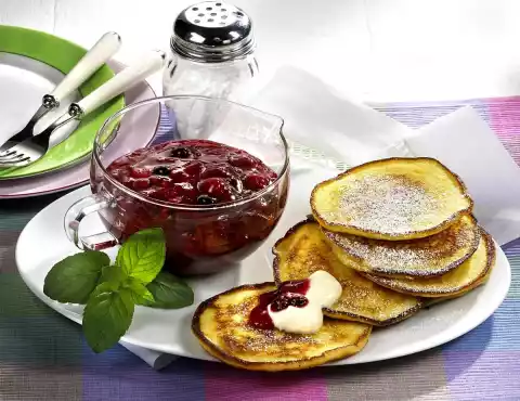 Heat 1 tablespoon of fat in a frying pan. Bake 4 more cakes from the remaining dough. Arrange with yoghurt and red fruit jelly and dust with icing sugar