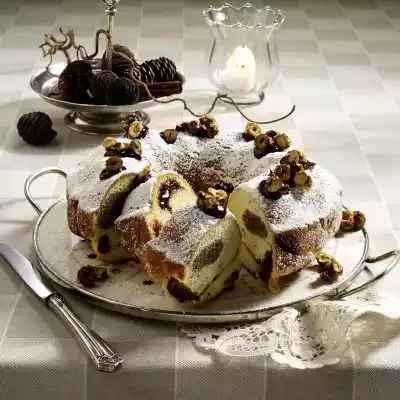 Place the dough balls alternately in the mould. Bake in a hot oven for 40-50 minutes. Leave to cool in the mould for about 10 minutes, then turn out of the mould. Meanwhile melt 100 g butter. Brush the still hot stollen alternately with butter and dust with icing sugar.