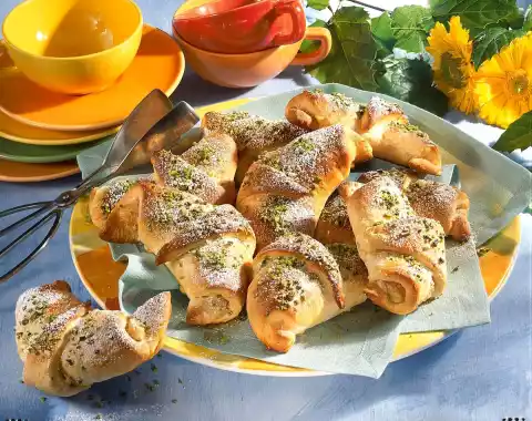 Sprinkle with pistachios and bake in the preheated oven (electric: 200 °C/ gas: level 3) for 15 minutes. If necessary, cover for the last five minutes. Let the croissants cool down and serve dusted with icing sugar.