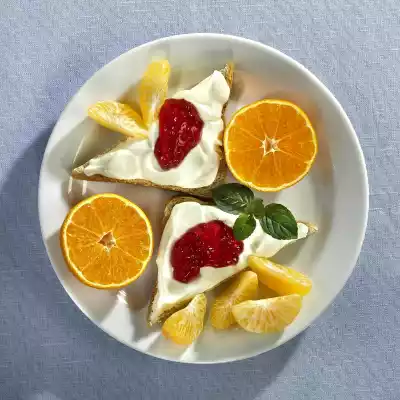 Toast whole grain toast, cut in half diagonally. Spread cream quark on top. Serve with 1 teaspoon of jelly. Halve or peel the clementines and remove individual fillets. Serve garnished with mint
