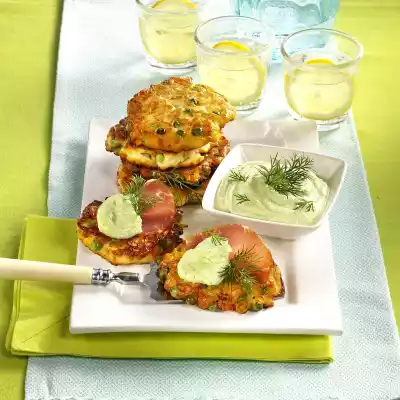 Blanch for 2 minutes in boiling salted water, drain. Peel and chop onion. Wash and chop dill and parsley. Puree onion and herbs. Mix with 200 g quark. Season to taste with salt, pepper and lemon juice. Mix the lentil dough, peas and carrots. Form 8 lentils with the help of 2 tablespoons and fry 4 lentils in 1-2 tablespoons of hot oil while turning over medium heat for about 4 minutes. Serve the lentils with salmon ham and herb quark.
