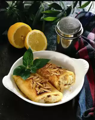 Melt the fat. Mix eggs, milk, flour, salt and melted fat. Cover the dough and let it swell for about 30 minutes. Meanwhile, for the filling, mix quark, sugar, lemon peel and juice, egg yolk and half of the almond slivers. Bake 4-6 pancakes in hot oil in a pan, one after the other, until golden brown on both sides. Take them out and put them warm on a plate in the preheated oven.
