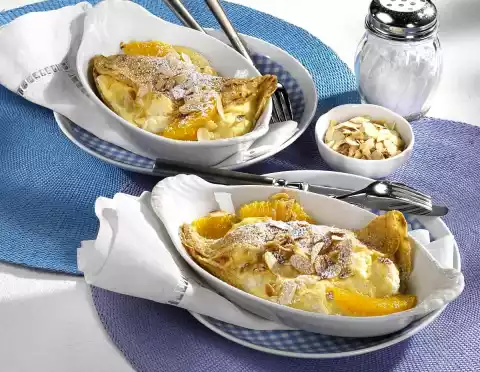 Fold the quark into the cooled down sugar egg mass. Place the pancakes in 4 ovenproof portion moulds and fill with the quark mixture. Spread orange filets on top. Bake in the preheated oven (electric cooker: 200 °C/ convection oven: 175 °C/ gas: level 3) for 10-12 minutes.