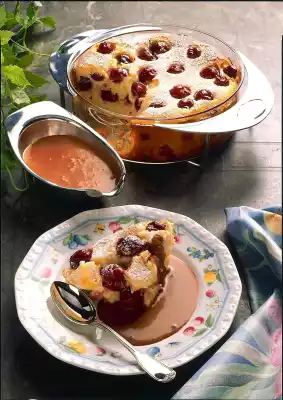 Drain the cherries on a sieve. Put half of the curd semolina mixture into a greased casserole dish (1 1/2 litre capacity). Layer 2/3 of the cherries. Pour the rest of the curd cheese semolina on top.