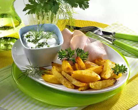 Wash the potatoes and cut into slices. Mix with oil, salt, pepper and paprika. Bake on a baking tray lined with baking paper in a hot oven (electric cooker: 200 °C/ circulating air: 175 °C/ gas: level 3) for about 40 minutes. Wash herbs and chop with garlic. Mix both with quark and season to taste. Arrange everything with cold cuts