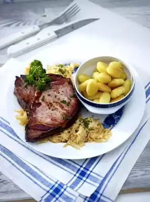 Wash the meat and dab dry. Heat 2 tablespoons of lard in a pan. Fry the gnocchi for about 8 minutes until golden brown. Heat 2 tbsp. lard in a second large pan. Fry the meat for about 3 minutes on each side.