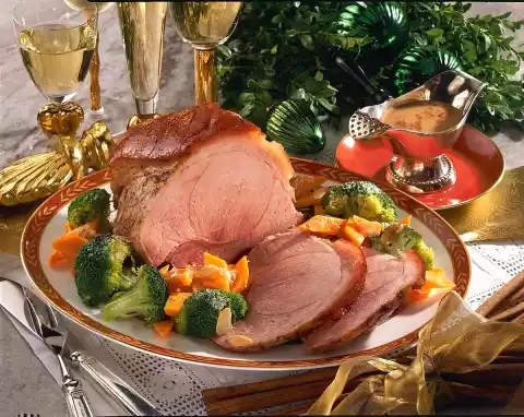 Rub the roast with pepper and cinnamon, place in a roasting pan and add 100 ml of water. Cover and bake in a preheated oven (electric: 175°C/ gas: level 2) for 11/2 -13/4 hours. In the meantime peel and quarter onions. Peel and wash carrots and cut 2 pieces roughly into slices. Add the onions and carrot slices to the frying pan after about 20 minutes and braise. Deglaze with 1/4 litre hot water.