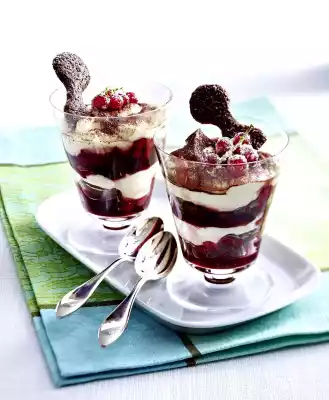 Layer the lady fingers, currant compote and mascarpone cream in dessert glasses. Sprinkle with cocoa powder and icing sugar and chill before serving. Moisten the currant panicles with water, roll in sugar and place on the glasses as a garnish