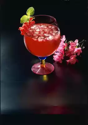 Pour rum and juice into a bulbous glass. Add Crashesd ice and top up with well chilled mineral water. Garnish with a currant panicle and lemon balm