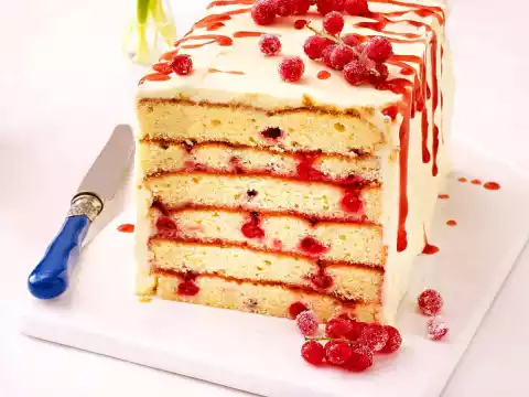 Mix the fish cheese and cream with the whisk of the hand mixer until smooth. Add icing sugar and whisk until thick and creamy. Spread the cake all around. Turn remaining currants in sugar syrup, drain and roll in 1 tbsp. sugar. Decorate the cake with redcurrants, cut into slices and halve