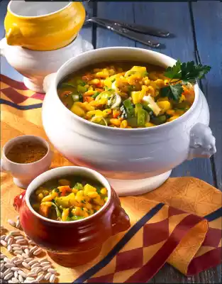 Clean, wash and drain the vegetables. Cut carrots lengthwise into quarters and pieces, leek into rings. Add potatoes and vegetables to the beans after about 20 minutes and cook with them. Season the finished stew with salt, curry and possibly some pepper.