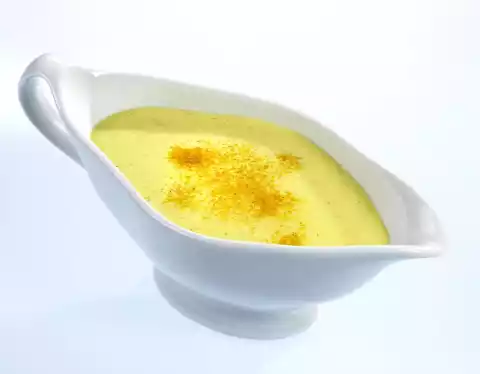 Heat the fat in a pot and sauté the flour in it. Add milk and vegetable stock while stirring, bring to the boil and simmer for about 5 minutes. Stir in curry powder and season to taste with salt and pepper