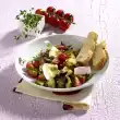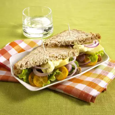Wash kumquats, dab dry and cut into slices. Cover the slices coated with curry quark with a salad leaf and a slice of Emmental cheese. Spread onion rings and kumquats on top.
