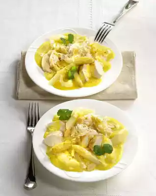 Remove flesh from skin and bones. Cut meat into slices. Peel onion and chop finely. Drain the asparagus and collect the stock. Measure out a good 1/2 litre stock (use the rest of the stock for other purposes). Heat the fat in a saucepan. Sauté the onion in it. Dust with flour and curry and sauté briefly. Deglaze with stock and coconut milk. Bring to the boil and simmer for about 5 minutes. Roast the almonds until golden brown.