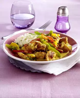 Wash the chicken filet, dab dry and cut into cubes. Clean, wash and cut the bell peppers into strips. Peel onion and garlic. Dice onion, chop garlic finely. Prepare rice in boiling salted water according to package instructions