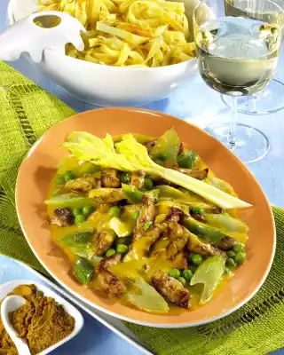 Fry the meat briefly and thoroughly. Add onions, fry briefly and salt. Sprinkle with curry, braise briefly and deglaze with wine and stock. Add celery, paprika and frozen peas, bring to the boil and simmer covered for about 5 minutes. In the meantime, put the pasta in plenty of boiling salted water and boil for about 5 minutes until it becomes bubbly. Pour the noodles onto a sieve, rinse briefly in cold water and drain. Melt the fat in a saucepan and toss the noodles in it. Keep warm. Stir the crème fraîche into the sauce, pour in the sauce thickener and bring to the boil briefly.