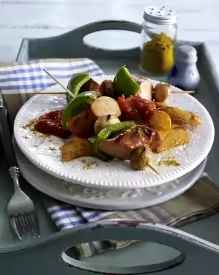 Clean, wash and cut the peppers into pieces. Clean and wash the mushrooms. Cut curry sausages into pieces of about 5 cm. Put sausage, paprika and mushrooms alternately on skewers. Grill on the hot grill for about 8 minutes while turning.