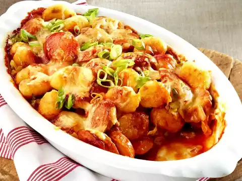 Pour sauce over the gnocchi and slices of sausage. Sprinkle with cheese. Bake in a hot oven for about 15 minutes. Serve with remaining spring onions.