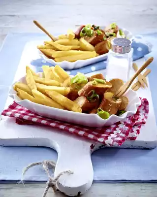 Heat the oil in a frying pan. Fry the sausages in it all around at medium heat for 2-3 minutes. Remove from the pan, cut into pieces and add to the sauce. Remove the chips and season with salt. Arrange with curry sausage in bowls and garnish with remaining spring onion rings