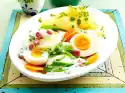 For the sauce, heat ketchup, honey, lemon juice and stock while stirring. Season to taste with salt, pepper and curry. Clean and wash the spring onions, cut into rings and stir into the sauce, except for a few rings for garnishing.