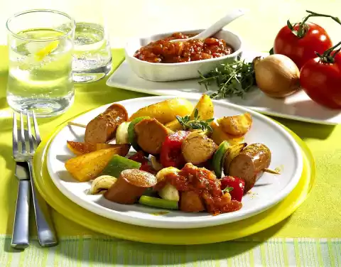Heat 1 teaspoon of oil, fry the onion and thyme in it. Add the chopped tomatoes. Season with salt, pepper and paprika powder. Let simmer a little bit. Cut the sausages into pieces. Cut 1 onion into slices.