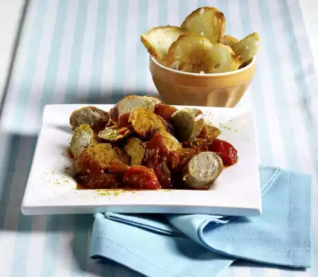 Cut the sausage into slices and arrange in a bowl with the sauce. Sprinkle with remaining curry. Add bread chips.