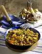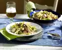 Remove bread chips from the pan. Fry sausage without fat at medium heat while turning for about 6 minutes, remove sausage from pan and keep warm. Stew onion and tomatoes in hot frying fat for about 3 minutes.