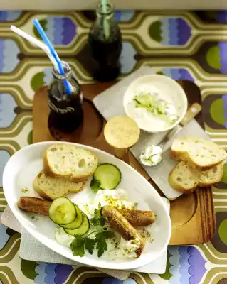 Season to taste with salt, pepper and lemon juice. Heat the oil in a pan and fry the sausages for about 10 minutes while turning them until crispy. Cut 4 sausages in half. Arrange 1 1/2 sausages each with tzatziki and bread on plates.