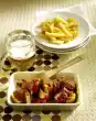 For the tzatziki, peel the onion and garlic and cut into fine cubes. Wash and clean the cucumber, cut off 16 thin slices and grate the remaining cucumber. Mix yoghurt, cucumber, onion and garlic.