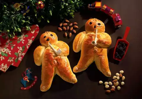 Separate the rest of the egg. Spread the "seams" for the head and arms with egg white. Put the pieces together to form four figures. Whisk egg yolk with remaining milk and brush the figures with it. Decorate with raisins, almonds and pipes. Bake on a baking tray lined with baking paper in a preheated oven (electric cooker: 200 °C/ gas: level 3) for 20 minutes