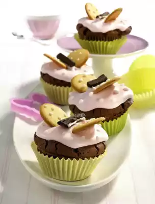 Halve the bark chocolate first crosswise and then lengthwise. Place 1 piece in the middle of each muffin. Press 2 biscuits each into the icing as butterfly wings. Cut off 1 small corner from the plastic bag at the bottom. Spray white dots on "wings" and muffins. Let the icing dry