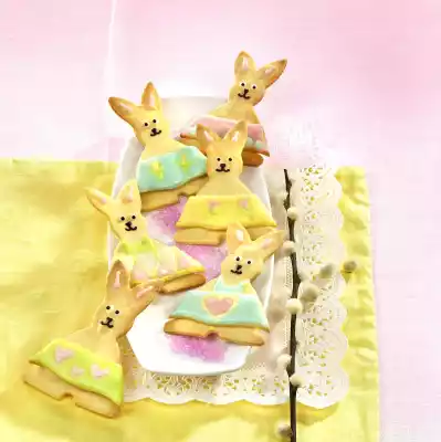 Place bunnies and aprons separately on a baking tray lined with baking paper. Bake the bunnies in a preheated oven (electric cooker: 175 °C/ convection oven: 150 °C/ gas: level 2) for about 15 minutes. Then bake the aprons at the same temperature for 10-12 minutes. Sieve 250 g icing sugar and mix with lemon juice. Remove 2 tablespoons from the icing. Quarter the rest of the mixture and colour it light yellow, light blue, light green and pink. Pour white and coloured icing into 1 freezer bag each. Cut off a small corner of each freezer bag. Melt the chocolate over a warm water bath, also fill into a freezer bag and cut off a small corner. Stick rabbit skirts with white icing on the rabbits and decorate rabbits with icing as you like. Use white icing to make small dots for the eyes and in the middle squirt a small dot with couverture.