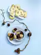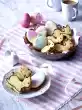 Quarter the rest of the mixture and colour it light yellow, light blue, light green and pink. Pour white and coloured icing into 1 freezer bag each. Cut off a small corner of each freezer bag. Melt the chocolate over a warm water bath, also fill into a freezer bag and cut off a small corner. Stick rabbit skirts with white icing on the rabbits and decorate rabbits with icing as you like. Use white icing to make small dots for the eyes and in the middle squirt a small dot with couverture. For nose and mouth also use couverture. Leave to dry