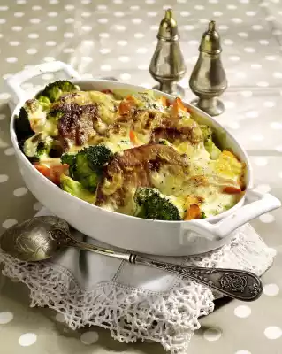 Season with mustard, salt and sugar. Layer meat, vegetables and sauce in a greased casserole dish. Sprinkle with cheese. Gratinate in a preheated oven (electric cooker: 200 °C/ convection oven: 175 °C/ gas: level 3) for approx. 20 minutes.