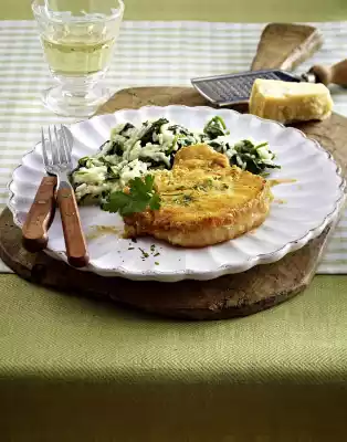 Wash the meat, dab dry and season with salt and pepper. Whisk eggs in a deep plate. Turn the chops one after the other in flour, egg and 150 g Parmesan cheese. Heat 4 tablespoons of fat in a large pan and fry the chops for about 8 minutes, turning them. Finish cooking the chops in a preheated oven (electric cooker: 125 °C/ circulating air: 100 °C/ gas: level 1) for approx. 15 minutes.