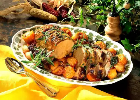 Season to taste with salt and pepper. Remove the roast from the fat pan. Dissolve roast with 1/8 litre water and pour through a sieve to the vegetables. Stir cornflour with a little water until smooth. Bind the vegetables with it. Season sauce with salt and pepper. Arrange everything on a plate. Garnish with rosemary and thyme