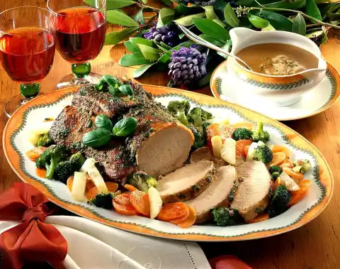 Wash the meat, dab dry and rub with salt and pepper. Heat the oil in a roasting pan, fry the meat all around, deglaze with stock and wine. Add juniper berries. Cook meat in a preheated oven (electric cooker: 175°C/ gas: level 2) for approx. 1 3/4 hours. 15 minutes before the end of the cooking time, spread half of the pesto on the roast. In the meantime clean, wash and slice the carrots. Clean, wash and cut kohlrabi into sticks. Clean, wash and cut broccoli into florets. Cook carrots and kohlrabi in boiling salted water for 15-20 minutes. Add broccoli about 5 minutes before the end of the cooking time and cook until done. Remove roast from the oven, pour roast stock into a pot, add cream and remaining pesto, bring to the boil, stir in sauce thickener and season to taste with salt, pepper and paprika. Arrange meat, vegetables and sauce on a plate and serve garnished with basil as desired. Add the rest of the sauce extra