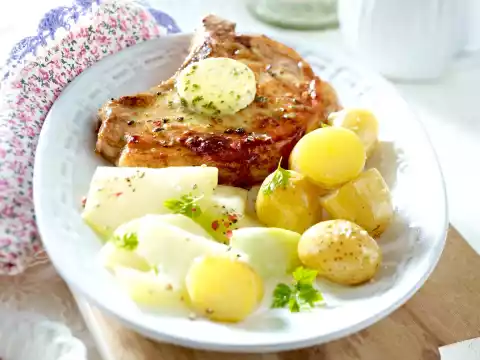 Drain the potatoes, allow to drain and toss in 2 tablespoons of butter. Place 1 slice of herb butter on each chop. Arrange everything.