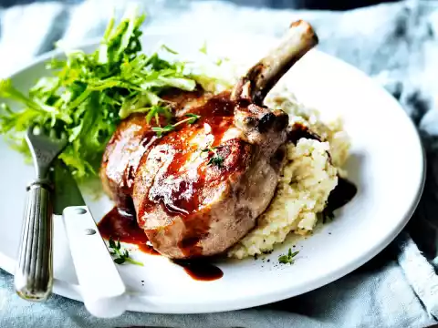 Remove the meat from the oven, wrap it in aluminium foil and let it rest for about 5 minutes. Heat cream and butter. Drain celery and potatoes and let them steam briefly. Gradually add the cream mixture to the vegetables with a potato masher. Season with salt and nutmeg. Mix salad with dressing. Serve with chops, sauce and mashed potatoes.