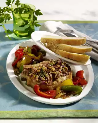 Clean, wash and roughly dice the peppers. Peel red onions and cut into strips. Wash parsley, shake dry, pluck leaves from the stalks and chop. Wash meat, dab dry, season with salt and pepper and turn in 2 tablespoons of flour.