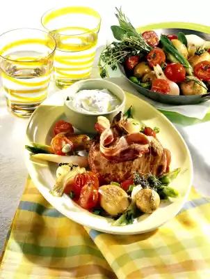 Heat the rest of the oil in a frying pan. Fry the potatoes and spring onions for about 8 minutes. Add herbs and tomatoes 3-4 minutes before the end of the frying time. Season with salt and pepper. Arrange potatoes, vegetables and meat with 1 slice of bacon each on a small plate.