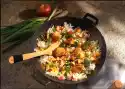 In the meantime, peel and wash the potatoes and cut them into quarters lengthwise. Fry in the frying fat for 10 minutes, turning constantly. Season with salt. Meanwhile peel and chop the onion. Melt the fat and fry the onion cubes in it until transparent.
