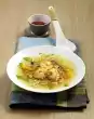 Cut the chillies lengthwise, remove the seeds and wash. Cut one red chilli pepper into cubes, the remaining pods into rings. Cut lemon leaves into fine strips, except for a few leaves for garnishing.