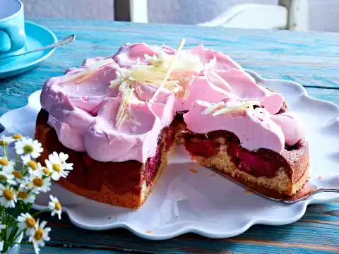 Put half of the dough into a greased springform pan (26 cm Ø) sprinkled with flour and smooth it down. Stir cocoa and 1 tbsp. almond drink into the remaining dough and spread carefully on the light-coloured dough. Spread the rhubarb pieces on the dough and press in a little. Bake in the preheated oven (electric cooker: 175 °C/ convection oven: 150 °C/ gas: see manufacturer) for 30-35 minutes, remove from oven and let cool on a cake rack for about 1 hour