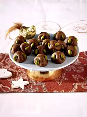With moistened hands form approx. 35 balls from it. Place them on a baking tray lined with baking paper. Mix egg yolk and cream. Brush the balls with it. Press three pistachio kernels at equal intervals on each ball.