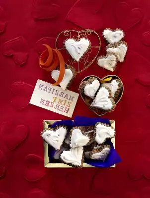 Sift the icing sugar. Beat the egg whites with the whisks of the hand mixer until stiff. Stir in icing sugar by the spoonful. To coat the hearts, remove approx. 5 heaped tablespoons of beaten egg whites. Finely grate the marzipan and stir it with vanilla sugar, cocoa, cinnamon, almonds and nuts into the remaining beaten egg whites